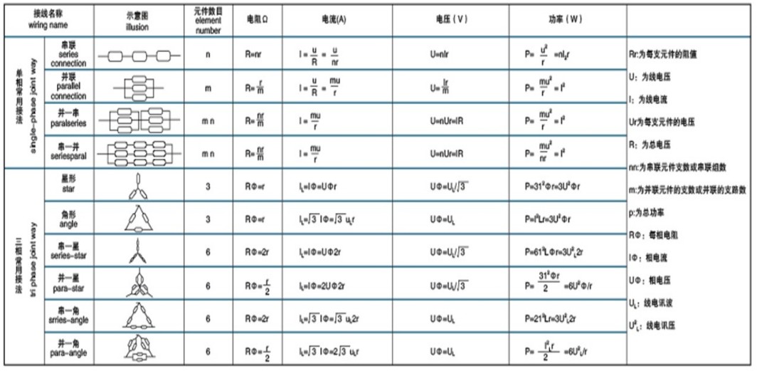硅碳棒元件的聯(lián)結(jié)方式可串可并,以并聯(lián)使用為優(yōu)。串聯(lián)使用時(shí),支路串聯(lián)支數(shù)不宜多于3支,常用聯(lián)結(jié)方式及其計(jì)算公式列于下表: